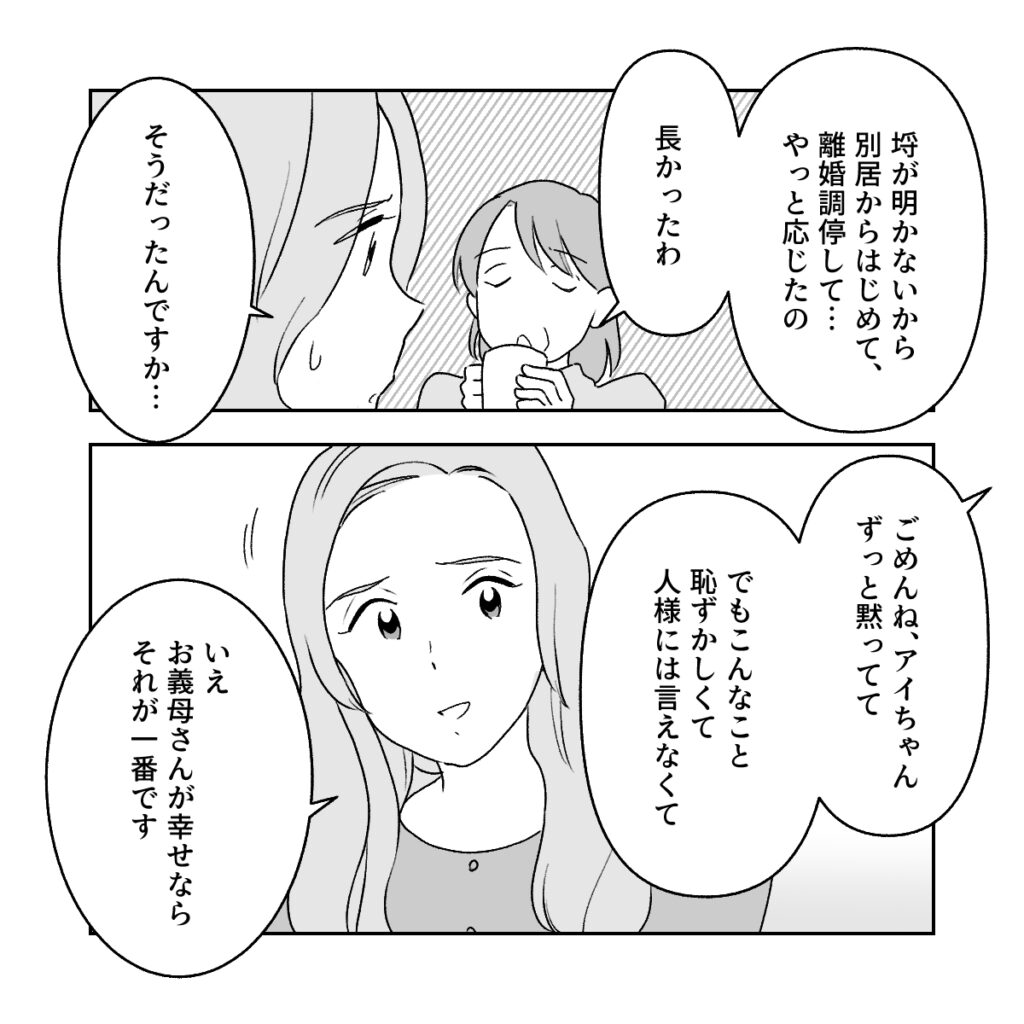 「埒が明かないから別居からはじめて、離婚調停して・・やっと応じたの。長かったわ」そう言いながらお茶を飲む義母に、「そうだったんですか・・」と壮絶な話に驚きながら呟くと、「ごめんね、アイちゃんずっと黙ってて。でもこんなこと恥ずかしくて人様には言えなくて」義母の言葉に、「いえ、お義母さんが幸せならそれが一番です」と答えた私。