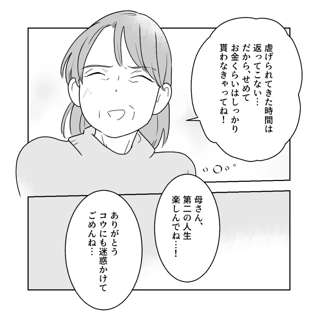 すると、「虐げられた時間は返ってこない・・だから、せめてお金くらいはしっかり貰わなきゃってね!」と笑顔で言う義母に、「母さん、第二の人生楽しんでね・・!」コウがそう言うと、「ありがとう。コウにも迷惑かけてごめんね・・」と義母が静かに答えたのでした。