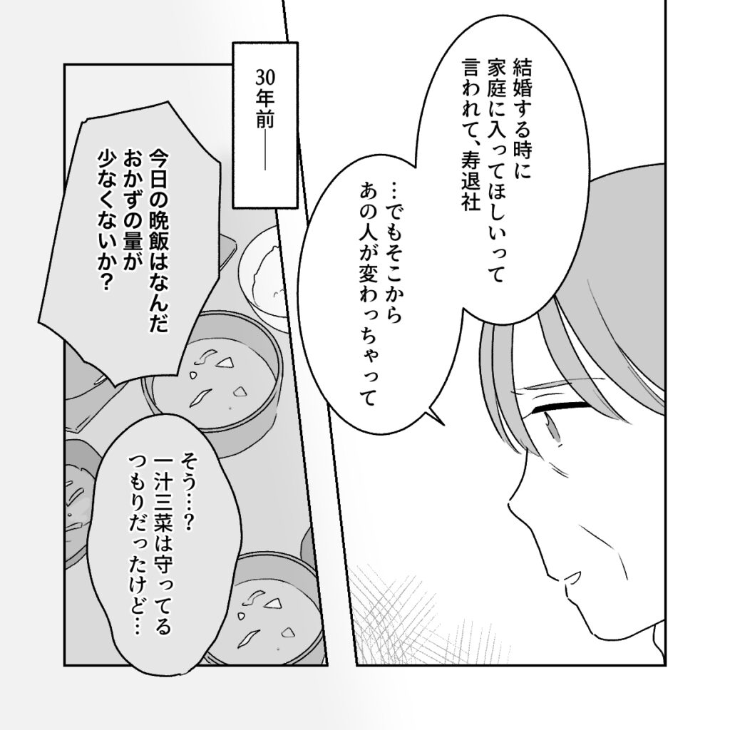 話は30年前に遡ります。「今日の晩飯はなんだ。おかずの量が少なくないか?」仕事から帰って来た義父は、食卓に並んだ夕食を見るなり不機嫌そうに言い、「そう・・?一汁三菜は守ってるつもりだったけど・・」と義母が返すと、