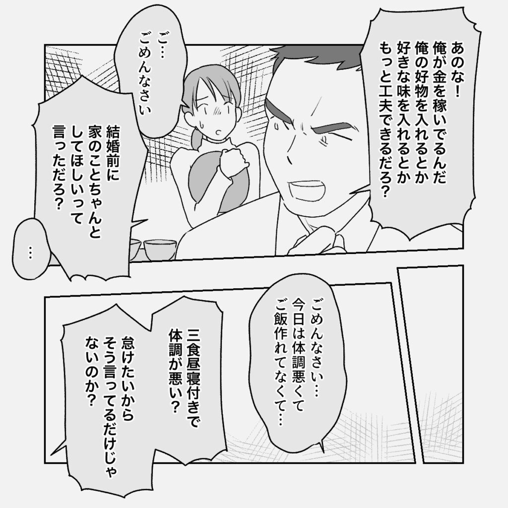 「あのな!俺が金を稼いでるんだ。俺の好物を入れるとか好きな味を入れるとか、もっと工夫できるだろ?」と強い口調で怒り始めました。「ご・・ごめんなさい」と謝るも「結婚前に家のことちゃんとしてほしいって言っただろ?」と言われ、義母が体調を崩してしまった時も「ごめんなさい・・。今日は体調が悪くてご飯作れてなくて・・」と謝っても「三食昼寝付きで体調が悪い?怠けたいからそう言ってるだけじゃないのか?」と体を心配するどころか夕食ができていないことを怒られました。