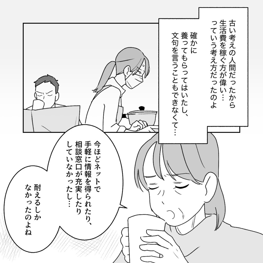 「古い考えの人間だったから、生活費を稼ぐ方が偉い・・っていう考え方だったのよ。確かに養ってもらってはいたし、文句を言うこともできなくて・・。今ほどネットで手軽に情報を得られたり、相談窓口が充実したりしていなかったし・・耐えるしかなかったのよね」と義母は当時を振り返りながら、どんなに辛くても耐えるしかなかったと話してくれました。