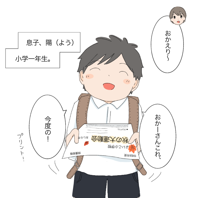 帰るなり、陽は「お母さん、これ、今度の!」と言って嬉しそうにプリントを差し出しました。『秋の大運動会』これは!私も楽しみに待っていたものです。