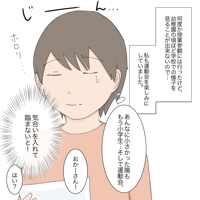 何度か授業参観には行きましたが、児童が黒板の方を向いて勉強している姿を後ろから見るスタイルの授業参観は、幼稚園の頃ほど学校での様子を見ることができなかったので、今度の運動会はとても楽しみな私です。あんなに小さかった陽ももう小学生。思わずホロリとしてしまいます。陽の姿をしっかりと目に焼き付けるため、気合を入れて望まないと!