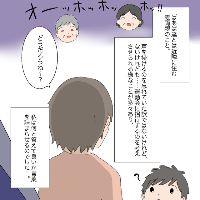 小学生になって初めての運動会。陽くんにとってはお父さんお母さんはもちろん、ばあば達みんなに頑張る姿を見てほしいですよね。けれどもよし子さんの様子から、クセの強い義両親なのだろうなと想像できます。近所に住んでいる義父母にひと言も声をかけない訳にもいかないでしょうし、困りましたね。