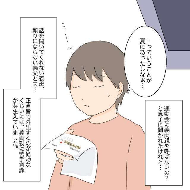 陽の運動会に義両親を呼ばないのか聞かれ、話を聞いてくれない義母と頼りにならない義父と夫のことを考えて正直億劫な気持ちになってしまっていた私。苦手意識のある義両親を運動会に招待するかどうか悩みました。