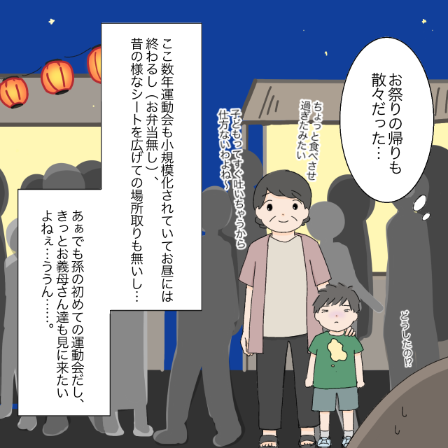義両親のアポなし訪問で予定を変更してまで行ったお祭りでは、「何食べる?」と言いながら陽と結を連れて出店の人込みに消えて行った義母が、嘔吐してTシャツを汚したままの陽を連れて戻ってきて「ちょっと食べさせ過ぎたみたい。子どもってすぐ履いちゃうから仕方ないわよね~」なんてのんきなことを言っていました。そんな義母を招待するかどうか悩みます。