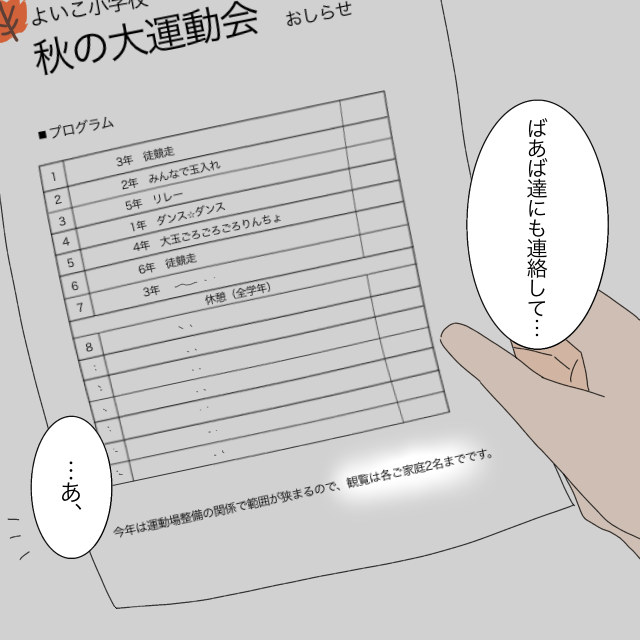 よし。私は決心して義両親に連絡しようと思いました。その時、ふと目にとまったプロブラムの1番下に書いてある1文。『観覧は各ご家庭2名までです。』
