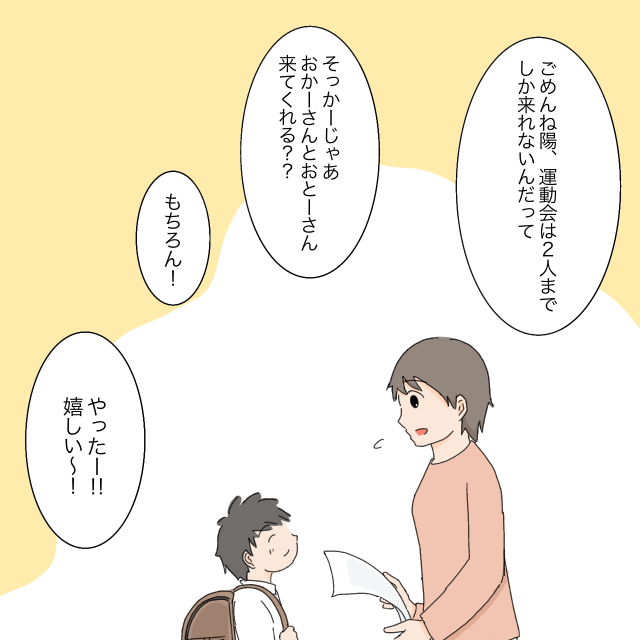 各家庭2名までの観覧と制限されているなら、必然的に夫と私で解決。「ごめんね陽、運動会は2人までしか来れないんだって。」と陽に伝え、夫と私はもちろん観に行くと伝えると「やったー!!嬉しい」と笑顔を見せました。