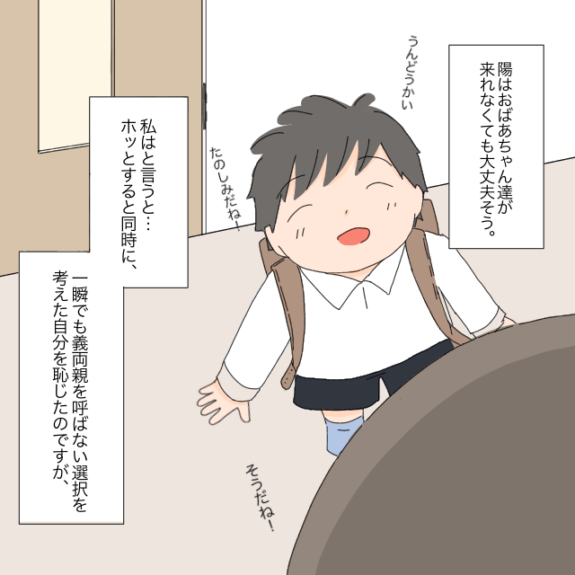 こちらの都合お構いなしだったり、話を聞いてくれなかったりする義母、そして頼りにならない義父と夫。何度も経験してしまうと、一緒に出掛けるのが億劫になってしまうよし子さんの気持ちもわかります。けれど陽くんの運動会に義父母を呼ばない選択を考えたことを恥じるよし子さんは優しい人ですね。