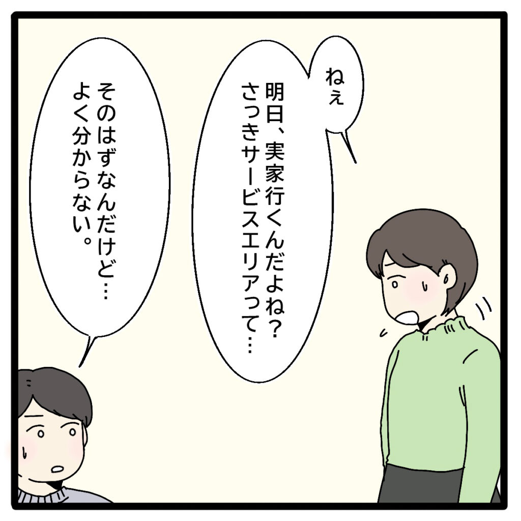 生後6ヶ月のあかりを連れて義実家に行く予定だったはずが、前日に突然「明日は家じゃなくてサービスエリアに来て」と言って一方的に電話を切った義母。夫と義母の会話が聞こえた私は心配になり「ねぇ。明日、実家行くんだよね?さっきサービスエリアって聞こえたんだけど」と夫に聞きました。「そのはずなんだけど・・よく分からない」と夫も困惑気味です。