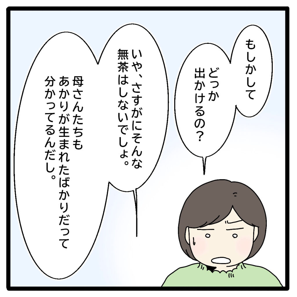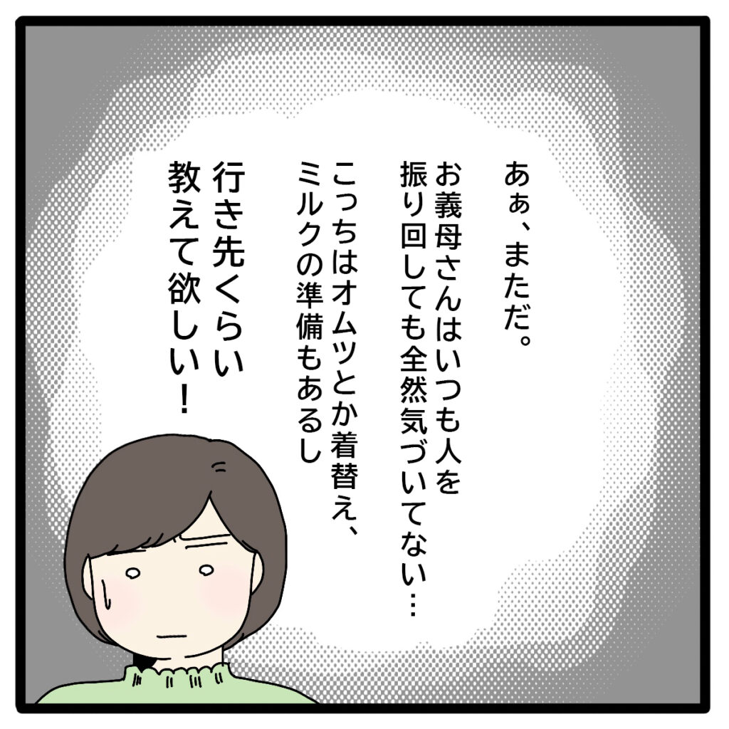 私は「あぁ、まただ」と内心モヤモヤしていました。お義母さんはいつもこうやって人を振り回していることに全然気づいていないのです。「こっちはオムツとか着替え、ミルクの準備もあるし、行き先くらいちゃんと教えて欲しい!」生後6ヶ月のあかりが一緒なので行き先によっては持ち物を追加する必要があるのに、肝心の行き先がわからないと何も準備できません。