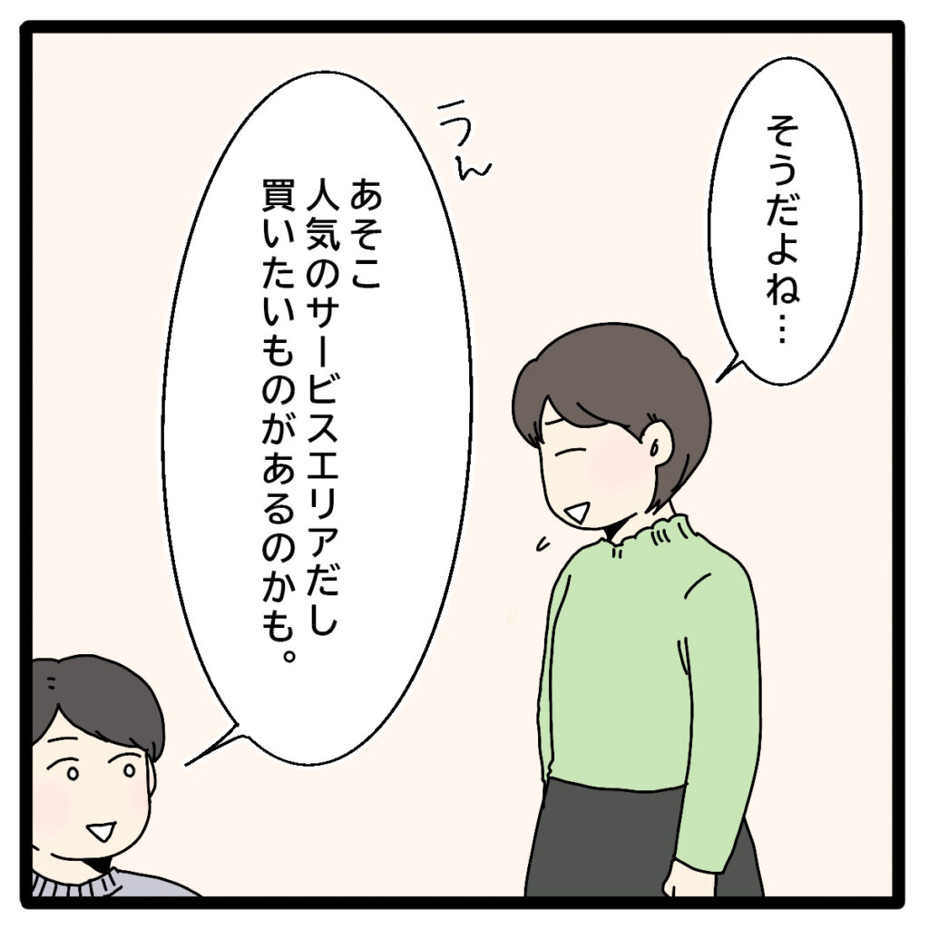 「そうだよね・・」と返しながらもまだ少し不安が残る私。でも夫は「うん。あそこ人気のサービスエリアだし、買いたいものがあるのかも」と楽観的です。