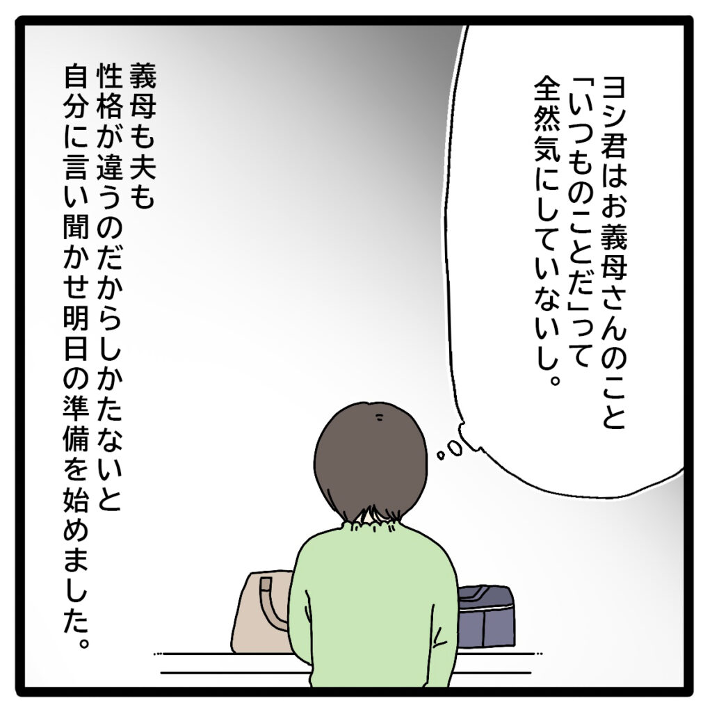 夫は義母のこういうところを「いつものことだ」と全然気にしていないので、行き先をしっかり確認してくれることもなく、かといって私も自分から聞くのは気が引けてしまいます。義母も夫もこういう性格の人なのだから仕方ないと自分に言い聞かせ、私は明日の準備を始めました。