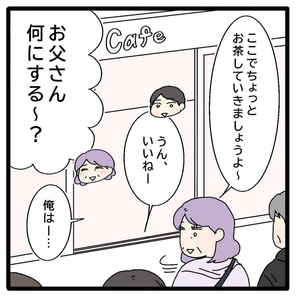 「ここでちょっとお茶していきましょうよ~」義母の言葉に、「うん、いいねー」と賛成するヨシオ。 「お父さんは何にする~?」と楽しそうな義母です。
