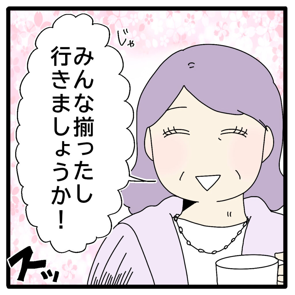 そして当日。待ち合わせのサービスエリアに到着すると、笑顔で私の存在をスルーする義母の言葉を聞いて、「私の『ついで感』すごいな・・」と呆れる私の隣で、「ところでなんでサービスエリア?」ヨシオが義母にたずねると、「わからない方がワクワクするでしょ~お楽しみよ!」とウキウキ。その言葉を聞いて、「ワクワク!?不安しかないんですが・・」と心の中で毒づきました。