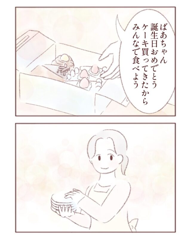 2人の息子たちは、手土産に買ってきてくれたケーキを並べると、「ばあちゃん、お誕生日おめでとう。ケーキ買ってきたからみんなで食べよう。」と義母に声をかけました。