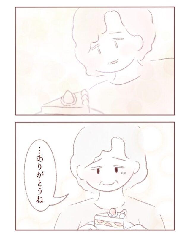 ジッとケーキを見つめたあと、目に涙をためて「ありがとうね。」それだけ言うと、ニッコリと微笑みました。