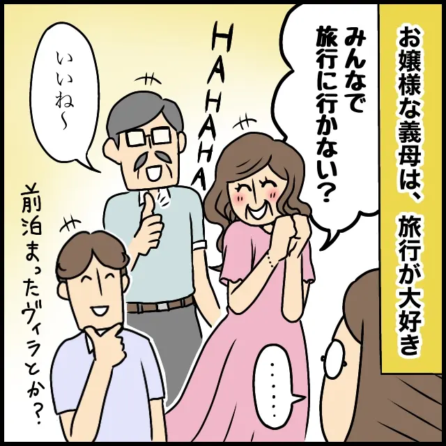 義家族とのギャップを感じたのはこんな場面でも・・。お嬢様な義母は、旅行が大好きです。あるとき、「みんなで旅行に行かない?」と義母が提案すると、義父も夫も「いいね~」「前に泊まったヴィラとか?」とノリノリ。この時点で、なんだか嫌な予感はしたんですよね・・。