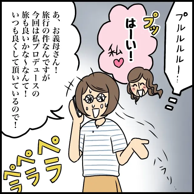 しばらく呆然とした後、私は義母に電話をかけました。「はーい!私!」とご機嫌で電話に出た義母に「あ、お義母さん!旅行の件なんですが、今回は私プロデュースの旅も良いかな~なんて!いつも良くして頂いているので!」と義母に話す隙を与えないくらい一気に話しました。