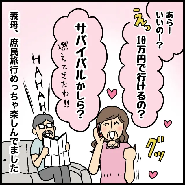 義母は、私の提案に嫌そうな素振りも全く見せず「あらーいいのー?」と喜んでくれ、おおまかな金額を伝えると「えっ!10万円で行けるの?サバイバルかしら?燃えてきたわ!!」と驚きつつもウキウキ。旅行のプランは私に任せてもらえることになり、結果、義母は庶民旅行をめちゃくちゃ楽しんでいました。庶民旅行はお嬢様な義母にとっては不便なこともたくさんあったはずですが、好奇心旺盛な義母は逆にそれが新鮮だったようで楽しんでくれ、とても喜んでくれました。お義母さん、次の旅行も私プロデュースでいいですか?