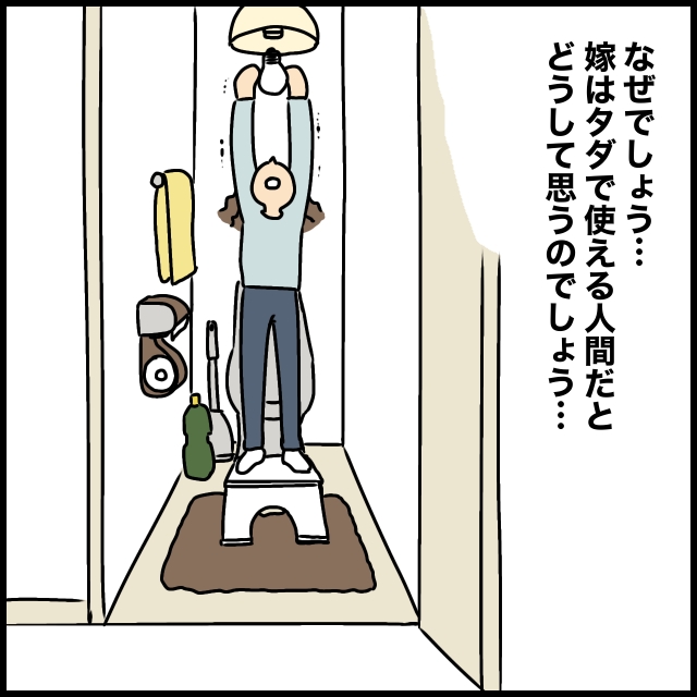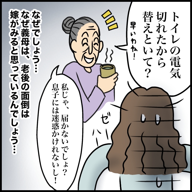 のんびりお茶を飲んでいた義母は、「トイレの電気切れたから替えといて?」と、それだけ。今すぐ来てという呼び出しが電球交換。義母が言うように確かに高いところでは届かないし椅子に乗ったりなんかしたら危ないけれど、今すぐと呼び出されるほど緊急?しかも「息子には迷惑かけれないし!」とまたいつものセリフ。私の都合はお構いなしです。なぜ義母は、細々した面倒は嫁がやって当然と思っているのでしょう。