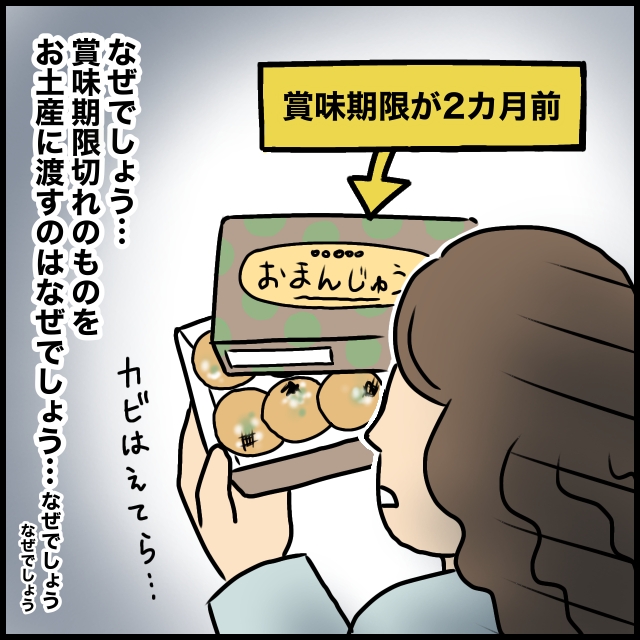 義母に頂いたお饅頭を楽しみに帰ってさっそく開けてみてビックリです。なんと賞味期限が2ヶ月も前のもので、カビだらけのお饅頭が並んでいました。誰かにお土産で貰ったものを放置していたお饅頭が、たまたま目に入っただけだったのでしょうね。無言でゴミ箱に放り投げたのは言うまでもありません。