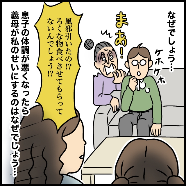 義実家に遊びに行った際、「ケホケホ」と咳をする夫を見て、「まあ!風邪引いたの!?ろくな物食べさせてもらってないんでしょう!?」と言い出す義母。息子の体調が悪くなったら私のせいになるのなぜなのでしょうか・・。