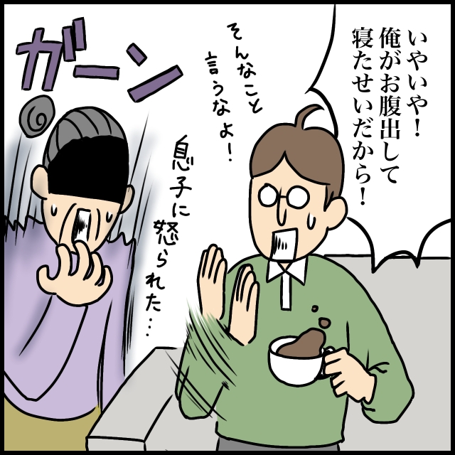 「いやいや、そんなこと言うなよ!俺がお腹出して寝たせいだから!」夫そう言うと、「息子に怒られた・・」義母は絶望的な表情を浮かべた後、
