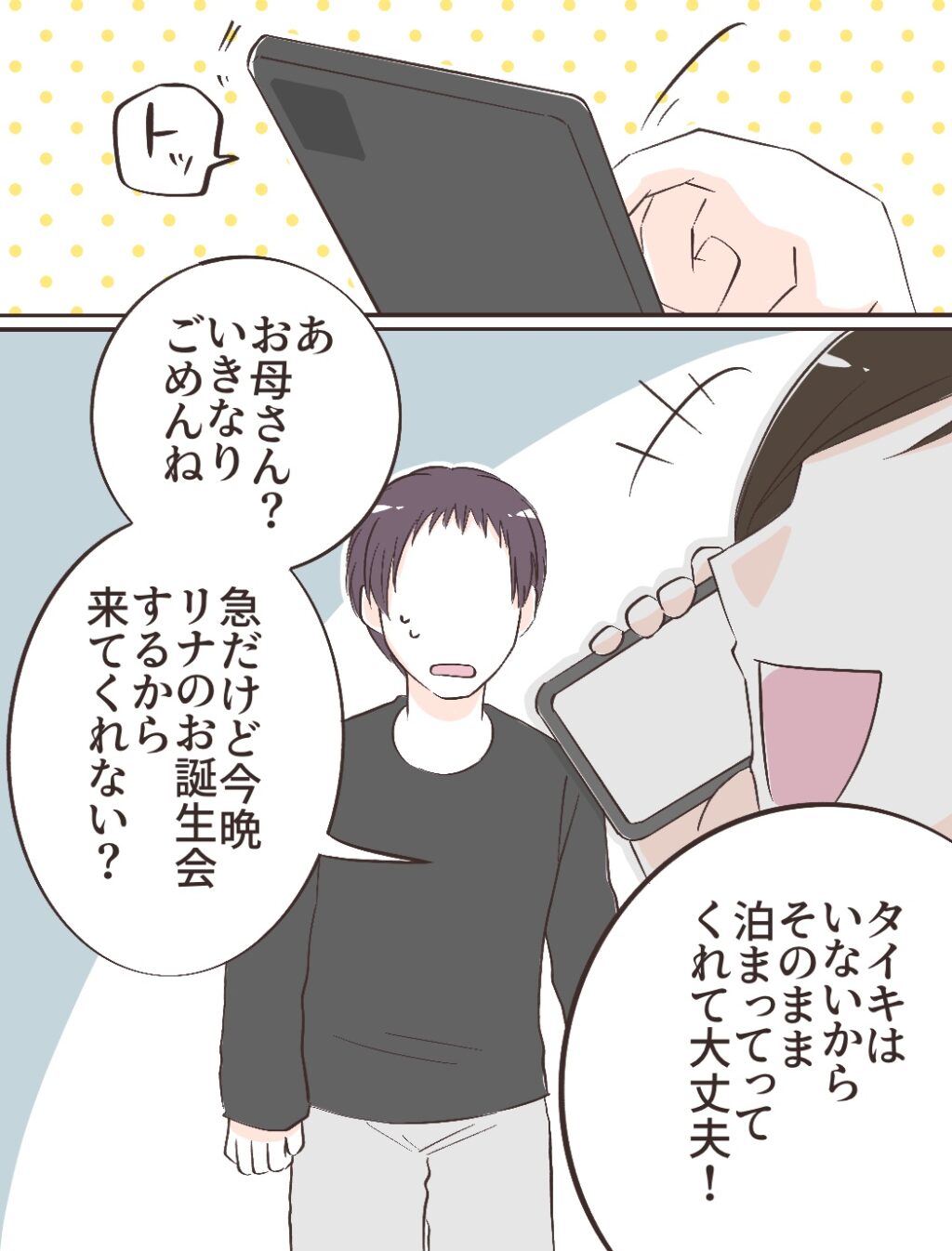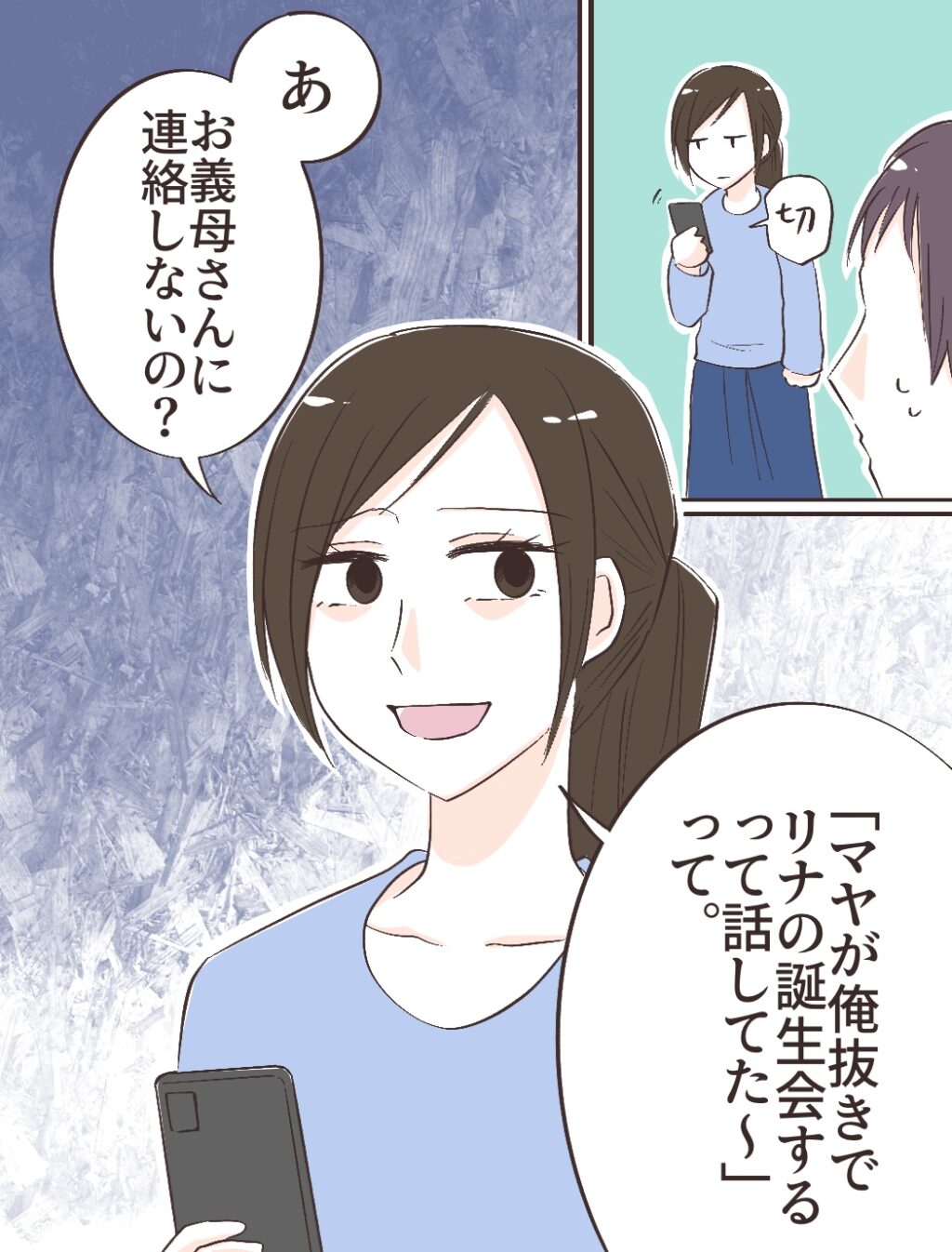 「あ、お義母さんに連絡しないの?『マヤが俺抜きでリナの誕生会するって話してた~』って」とタイキをじっと見ると、