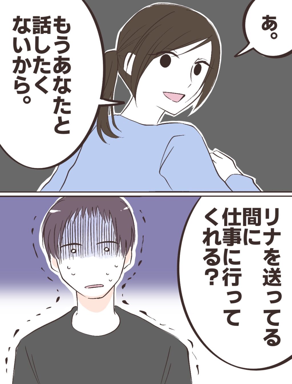すかさず「あ。もうあなたと話したくないから。リナを送ってる間に仕事に行ってくれる?」私がそう言うと、タイキは震えているよう。
