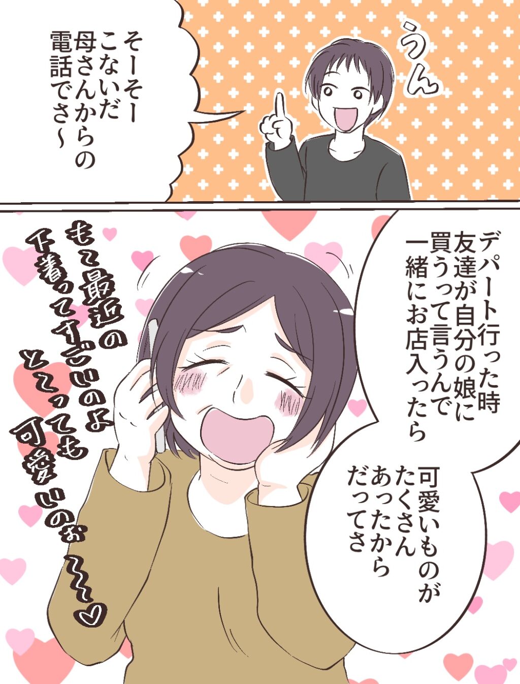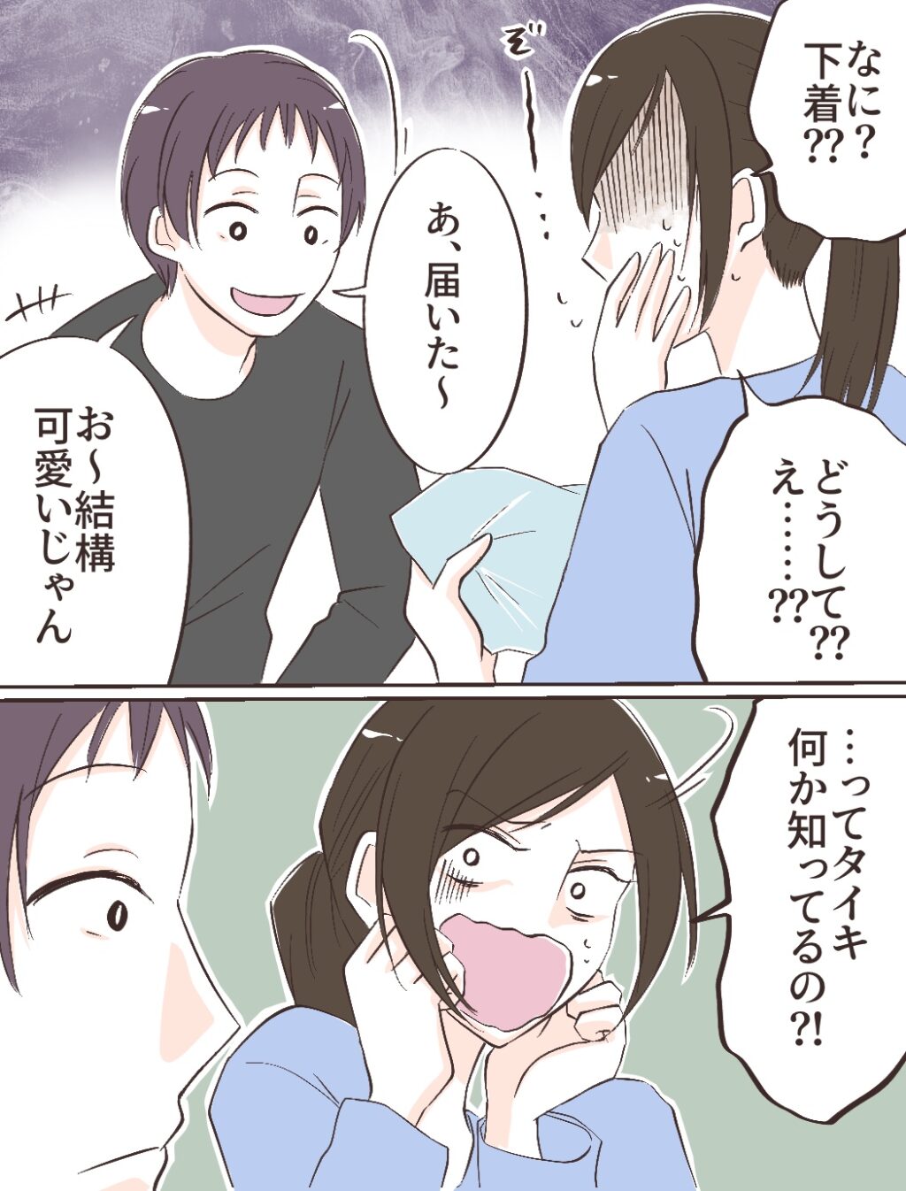 すると、タイキが「そーそー。こないだ母さんからの電話でさ~」と事の経緯を話し始めました。「デパート行った時、友達が自分の娘に買うって言うんで一緒にお店入ったら、可愛いものがたくさんあったからだってさ」とあっけらかんと話すタイキ。義母は「も~最近の下着ってすごいのよ。と~ってもかわいいのぉ~!」と大興奮だったそう。