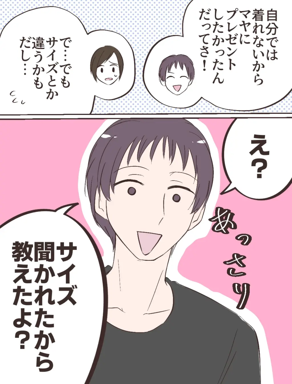 「自分では着れないからマヤにプレゼントしたかったんだってさ!」と笑顔で説明してくれたタイキに「で・・でも、サイズとか違うかもだし・・」と戸惑いながら答えると、「え?サイズ聞かれたから教えたよ?」と当たり前のようにあっさり答えたタイキ。