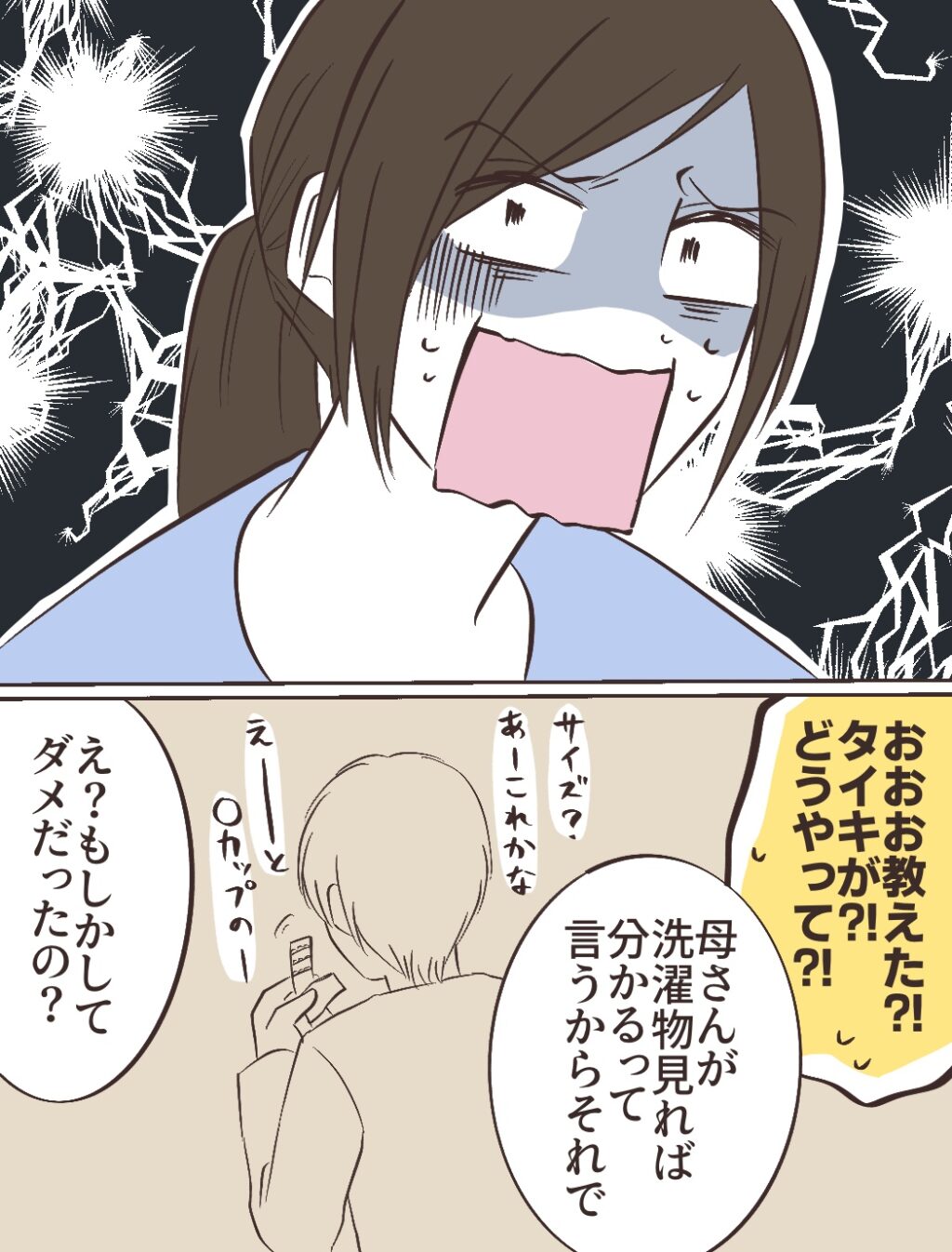 はい!??「おおお教えた?!タイキが?!どうやって?!」私の頭の中はクエスチョンだらけ。パニックになりながら聞くと、「母さんが洗濯物見れば分かるって言うからそれで。え?もしかしてダメだったの?」悪びれもせず平然とそう言われ、言葉も出ませんでした。
