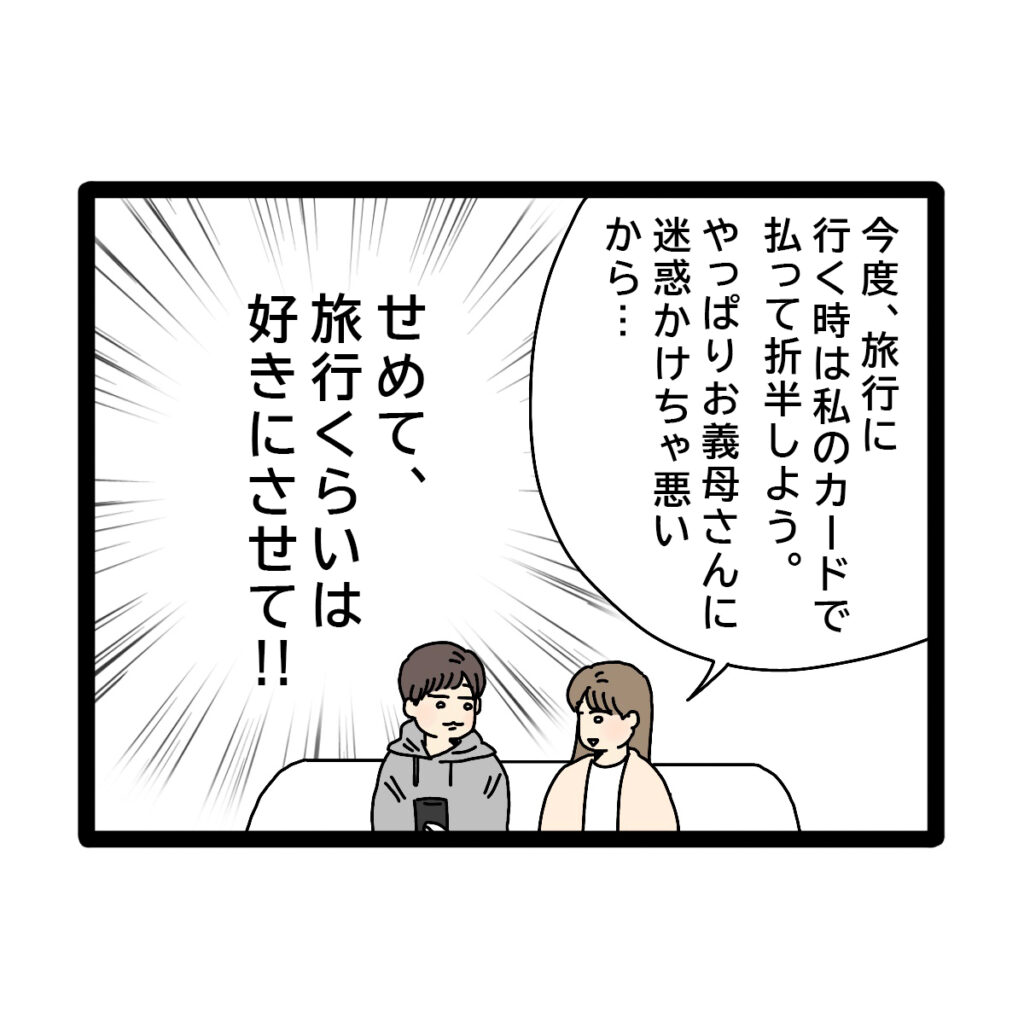 「提案があるんだけどさ~」とコウタさんに話を切り出したアヤカさんは、「今度、旅行に行く時は、私のカードで払って折半しよう。やっぱりお義母さんに迷惑かけちゃ悪いから・・」と言いながら、「せめて旅行くらいは好きにさせて!!」と心の中で叫んでいました。