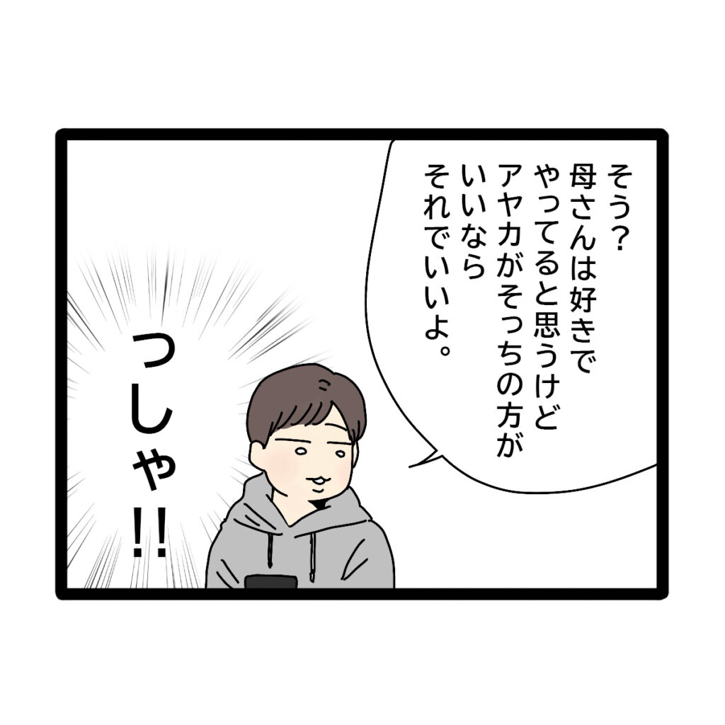 アヤカさんにそう言われたコウタさんは、「そう?母さんは好きでやってると思うけど、アヤカがそっちの方がいいならそれでいいよ」と深く考えることのないコウタさんの言葉を聞き、「っしゃ!!」とアヤカさんは心の中でガッツポーズ!