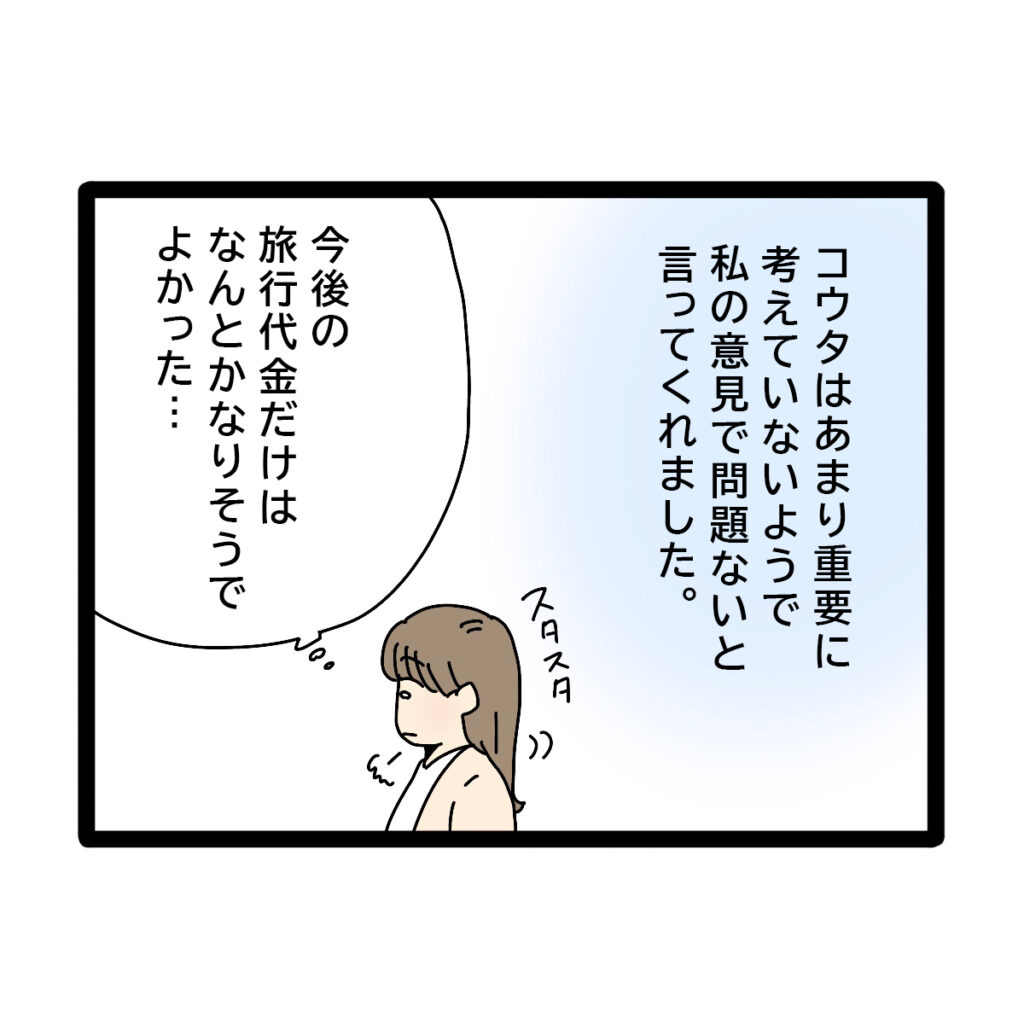 どうやらコウタさんはあまり重要に考えていない様子で、アヤカさんの意見で問題ないと答えたよう。そして、「今度の旅行代金だけはなんとかなりそうでよかった・・」と心の中で呟くアヤカさん。