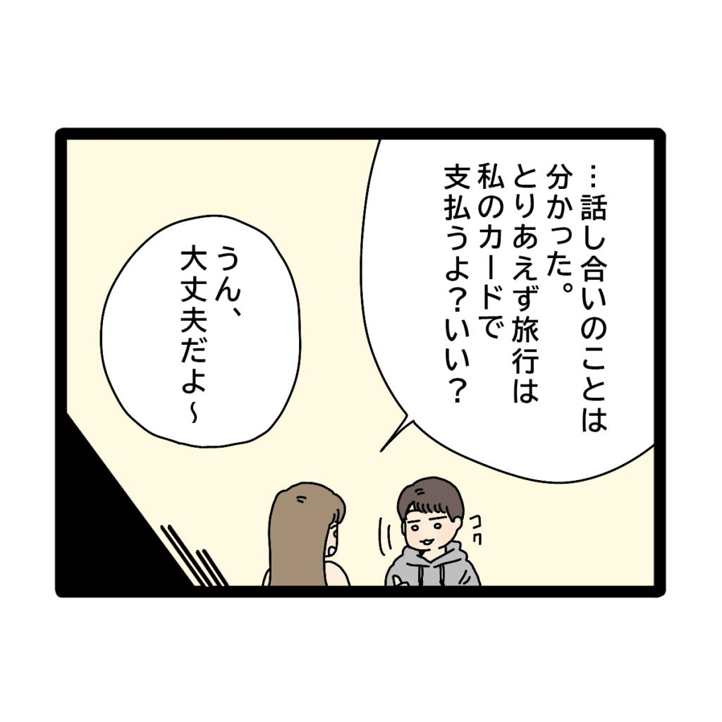 アヤカさんは「話し合いのことは分かった。とりあえず旅行は私のカードで支払うよ?いい?」とコウタさんに念を押しました。能天気なコウタさんは、どちらでも良い、と言う感じで「うん、大丈夫だあよ~」と頷きました。