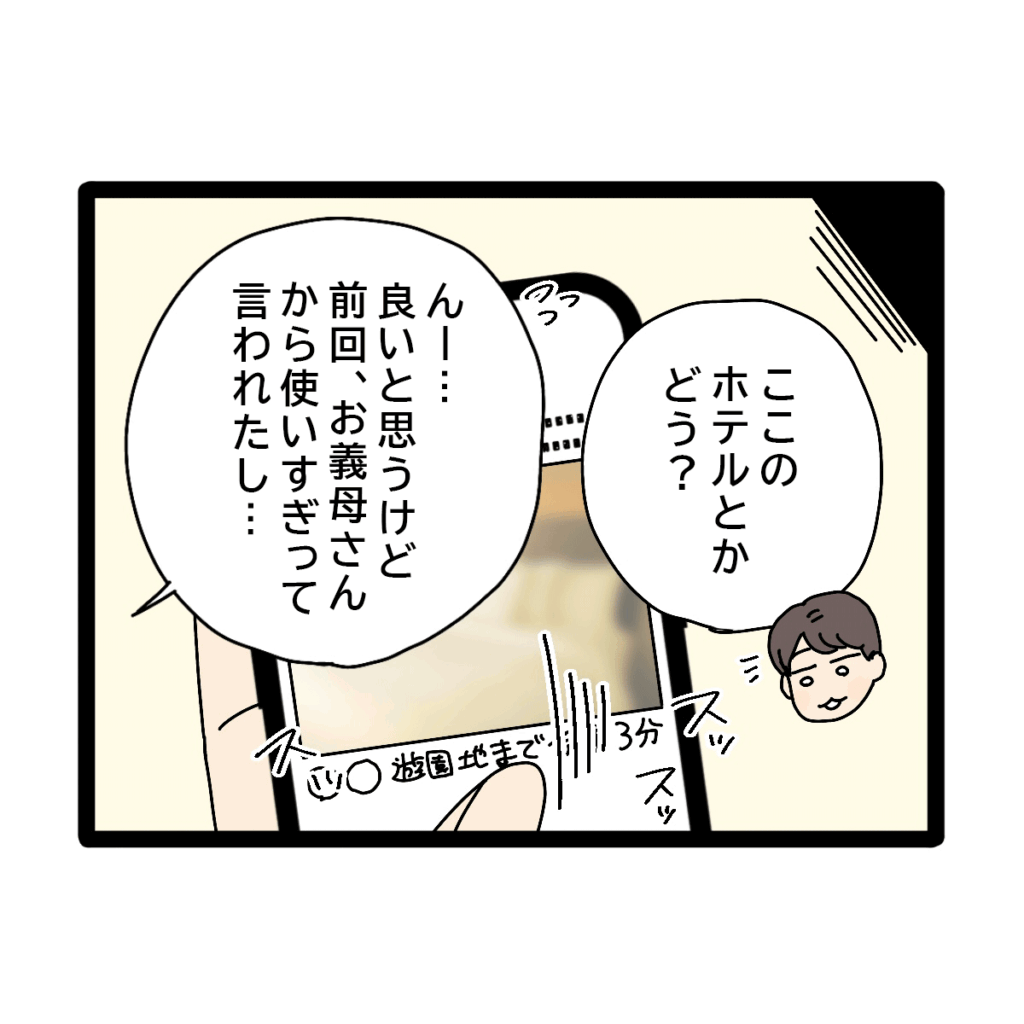 義母のお金の管理のことは気になるけれど、旅行はとても楽しみアヤカさん。「ここのホテルとかどう?」なるべく遊園地の近くのホテルを探してくれるコウタさんですが、「んー・・・良いと思うけど前回、お義母さんから使いすぎって言われたし」と、料金が気になってしまいます。
