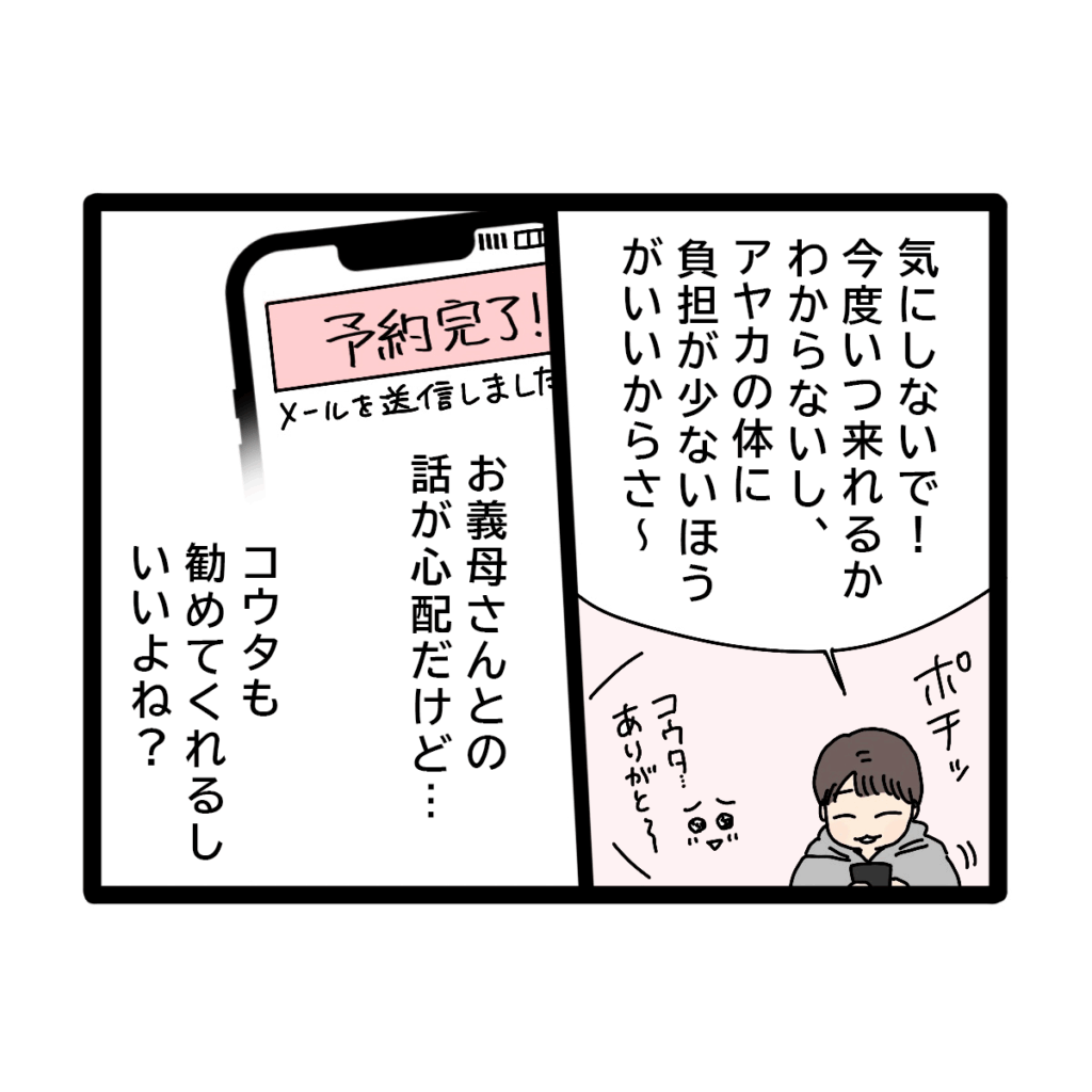 料金のことを気にしてなかなか決められないアヤカさんに、コウタさんは「気にしないで!今度いつ来れるかわからないし、アヤカの体に負担が少ない方がいいからさ~」と優しく言ってくれました。お義母さんとの話は心配でしたが、アヤカさんはコウタさんの優しさに甘えることにしました。「コウタも勧めてくれるし、いいよね?」