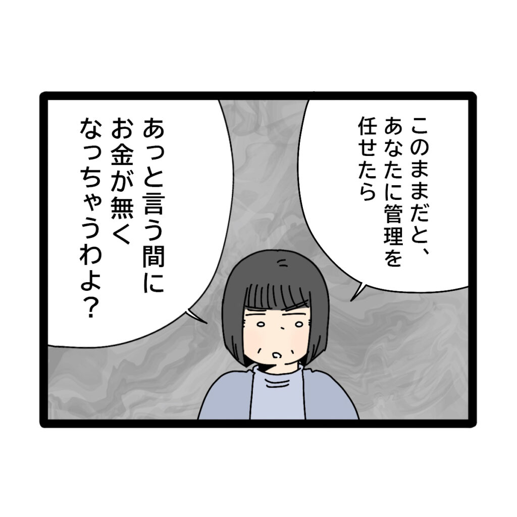 「このままだと、あなたに管理を任せたら、あっと言う間にお金が無くなっちゃうわよ?」厳しい表情でそう言った後、