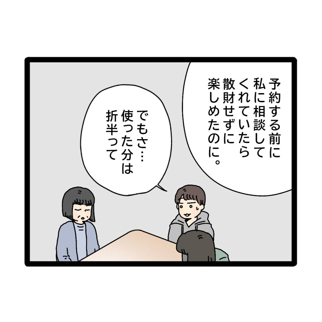 「予約する前に、私に相談してくれていたら、散財せずに楽しめたのに」義母が平然とそう言うと、「でもさ・・使った分は折半って」コウタさんがそもそものルールについて話すと、