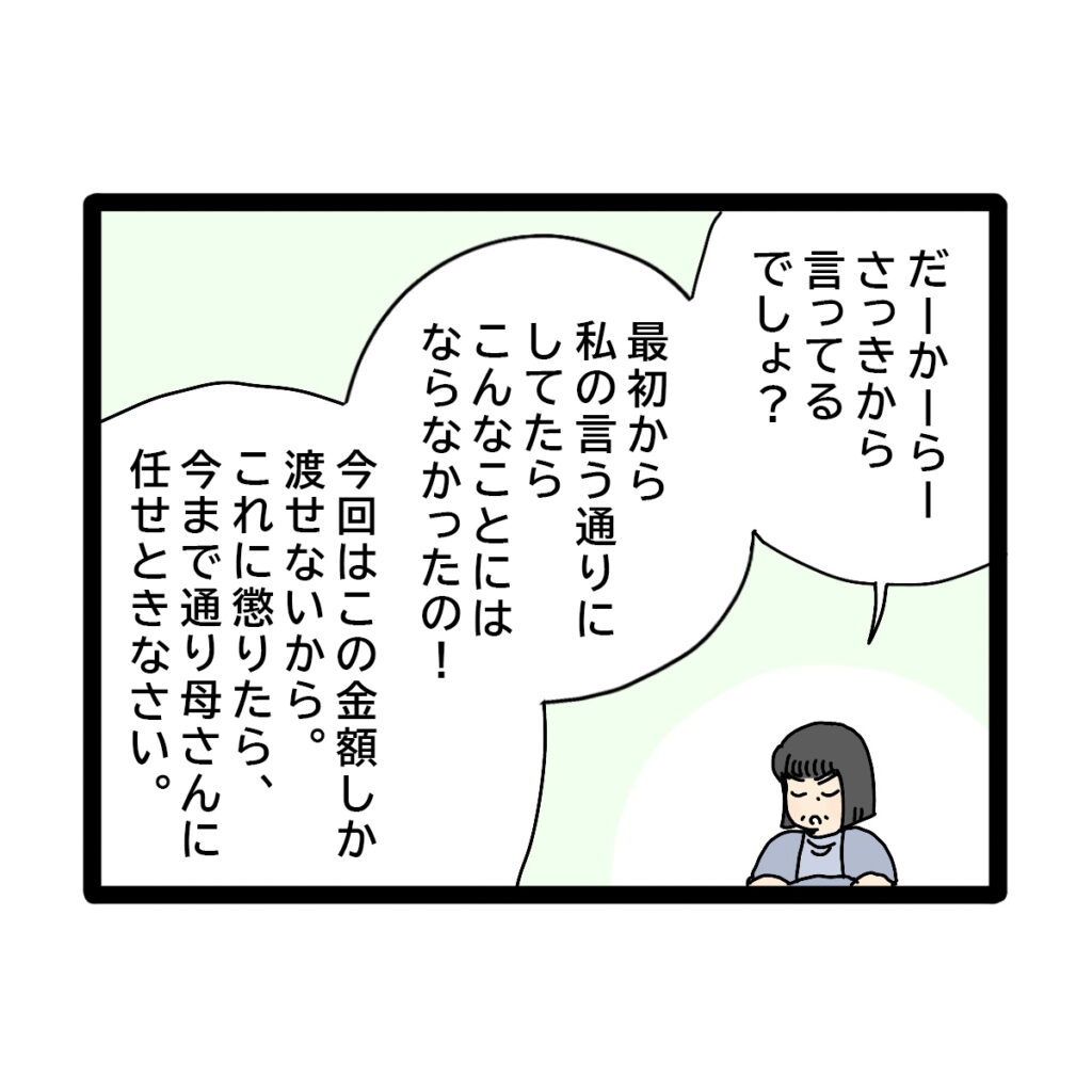 「だーかーらー、さっきから言ってるでしょ?最初から私の言う通りにしてたら、こんなことにはならなかったの!今回は、この金額しか渡せないから。これに懲りたら、今まで通り母さんに任せときなさい」義母が結論を言い渡すようにそう言うと、