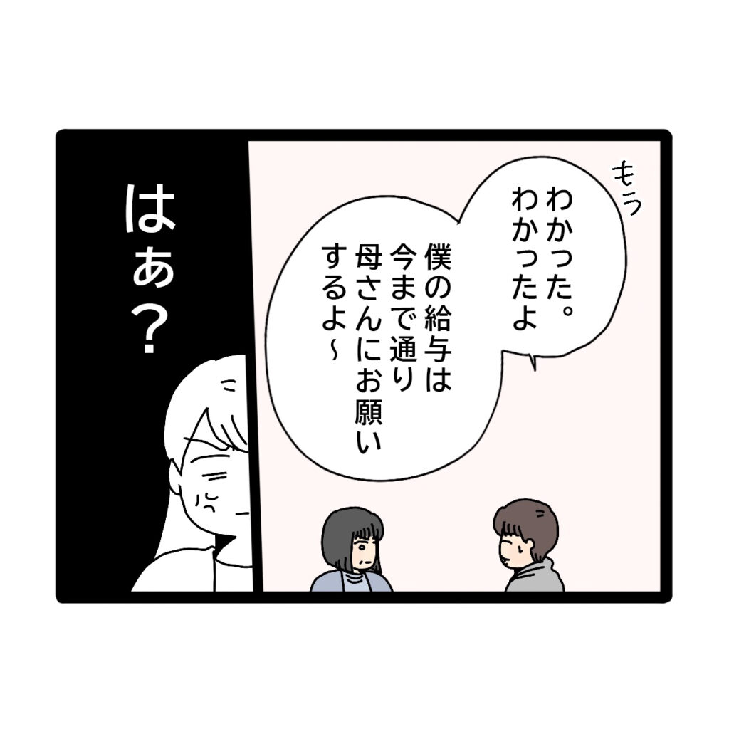 使った分のお金を折半と言うルールのもとに、遊園地旅行を楽しんだアヤカさんとコウタさん。でも、節約もせず、私のアドバイスも聞いていない、と不機嫌そうな義母に、「今回は8万円お返しするわ」と封筒を差し出されたものの、折半の金額には4万円も足りません。「僕がそうしたかったの!」とコウタさんが反論するも、「そんなんだから母さんがお金の管理をしてるんでしょ?」と一蹴。「最初から私の言う通りにしなかったから、こんなことになった」そう言い張り、「今回はこの金額しか渡せない」と開き直る義母に、「もうわかったよ。僕の給与は今まで通り母さんにお願いするよ。と義母の言葉を丸のみするコウタさん。その言葉を聞いて、アヤカさんは「はぁ?」と怒りがこみ上げてきました。