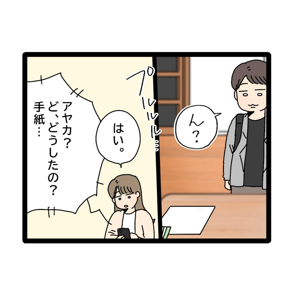 アヤカさんが居ないことを不思議に思いながらリビングに行ったコウタさんは、テーブルの上に置かれた手紙と預金通帳を見つけて仰天。アヤカさんが実家に帰ってしまったと分かり大慌てで電話をかけました。