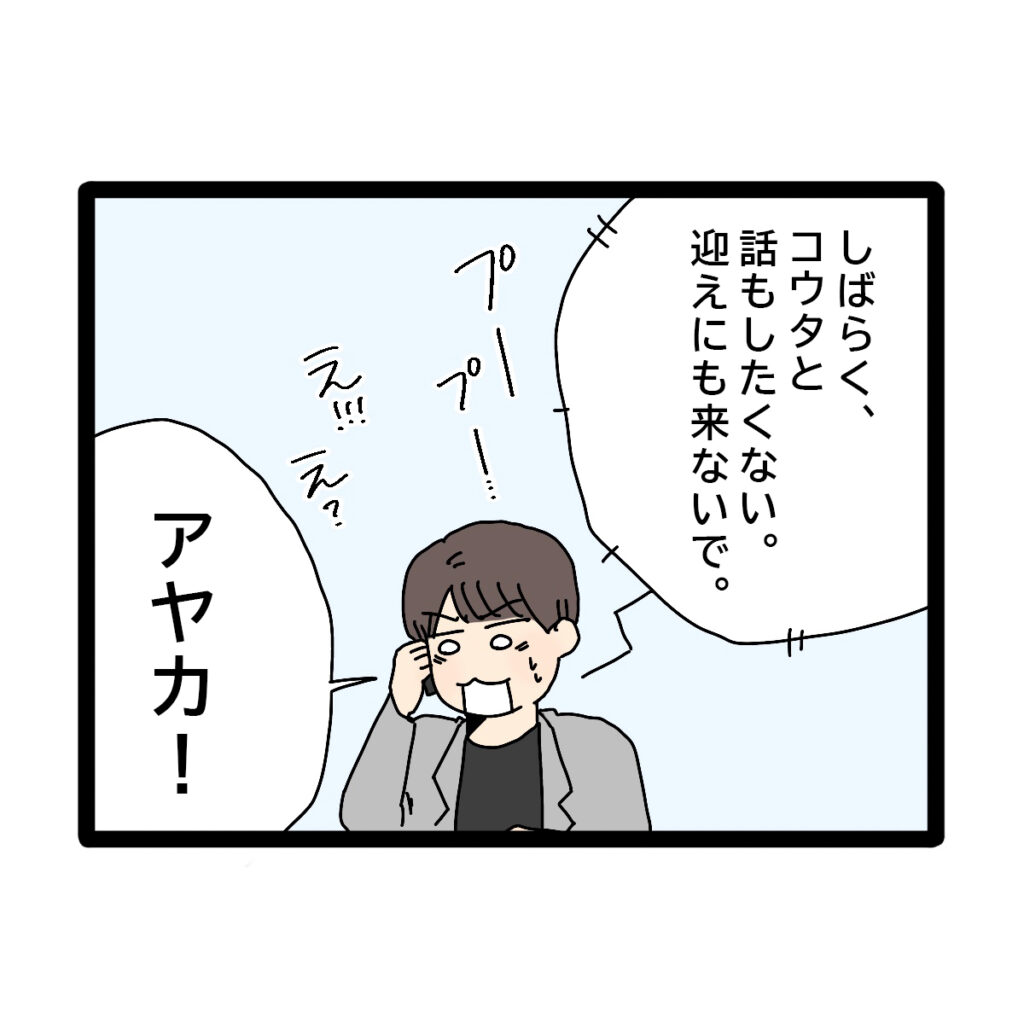 ここまで行動で示してもまだアヤカさんの怒りの理由が分からないコウタさん。アヤカさんは「しばらくコウタと話しもしたくない。迎えにも来ないで」とピシャリと言って一方的に電話を切りました。電話を切られたコウタさんは「え!!!え?」と動揺。