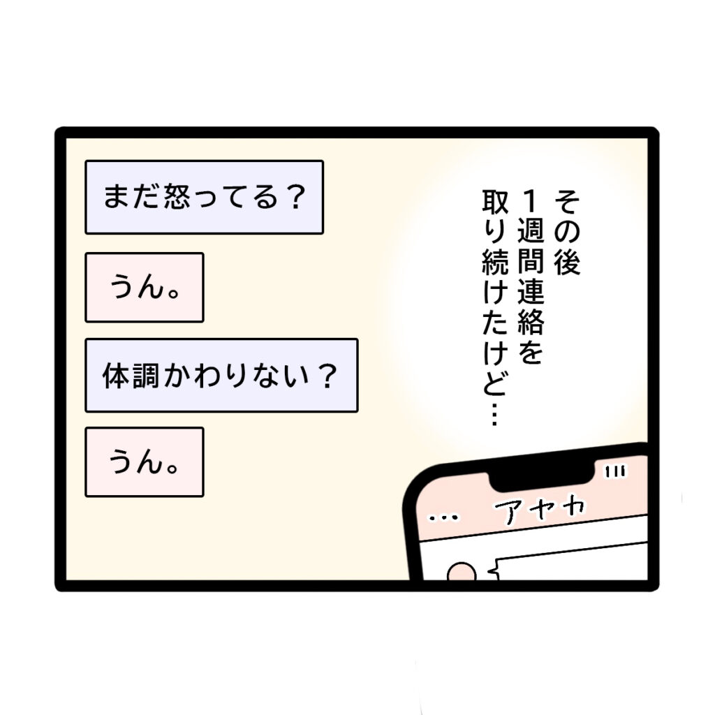 その後、アヤカさんとコウタさんは1週間ほどメッセージのやり取りを続けました。内容は「まだ怒ってる?」「体調かわりない?」と様子を伺うコウタさんにアヤカさんが素っ気なく「うん」と返すだけでした。