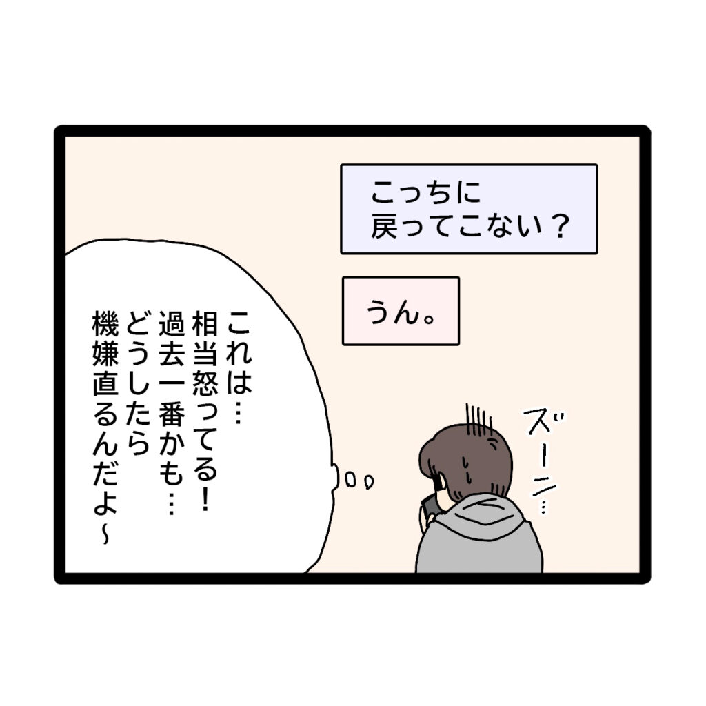 コウタさんが「こっちに戻ってこない?」と聞いても、アヤカさんは「うん」とばっさり。アヤカさんからの返信の様子で「これは・・相当怒ってる!過去一番かも・・。どうしたら機嫌直るんだよ~」と落ち込むコウタさんですが、アヤカさんがなぜ怒っているのかについてはまだ真剣に考えないようですね。