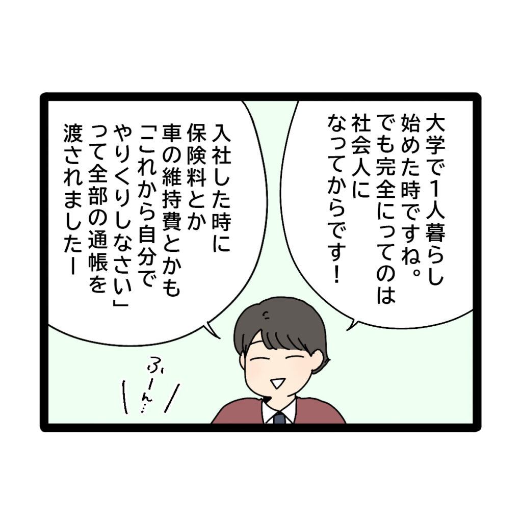 「大学で1人暮らし始めた時ですね。でも完全にってのは社会人になってからです!入社した時に保険料とか車の維持費とかも『これから自分でやりくりしなさい』って全部の通帳を渡されましたー」と話すハルト君。「ふーん・・」と平静を装うコウタさんですが、自分よりも何年も年下のハルトくんが自分でお金の管理をしていると聞き、内心はかなり動揺しています。