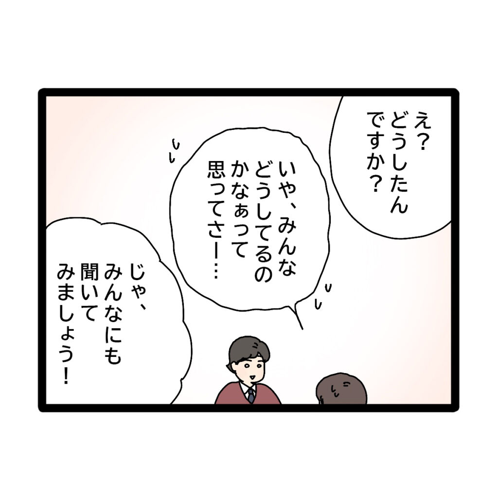 突然の質問に「え?どうしたんですか?」と不思議がるハルト君に、「いや、みんなどうしてるのかなぁって思ってさー・・」と動揺を悟られないように取り繕うコウタさん。すると、ハルト君は「じゃ、みんなにも聞いてみましょう!」と言い出しました。