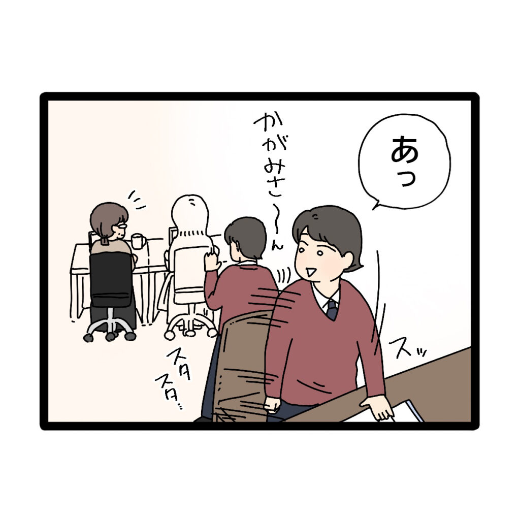 ハルト君は周りを見回すと、「あっ」と言ってスタスタと先輩社員のかがみさんのところへ歩き出しました。